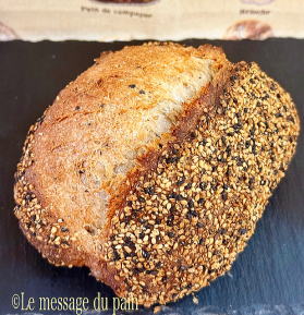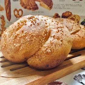 カンパーニュ・オ・セザム ![]() 2種類のごまが入った 香ばしい誰にも好まれる カンパーニュです そのまま召し上がっても 和素材などに合います |